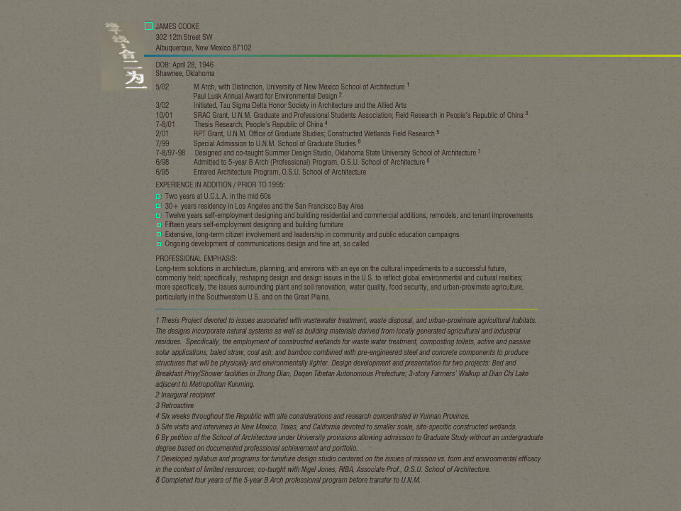 In May of 2002, the University of New Mexico awarded the Master’s in Architecture with distinction to me.